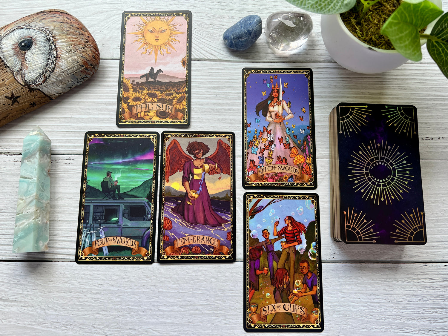 - Guidebook: A full-colour visual guidebook detailing the symbolism, meaning, and interpretation of each card, along with sample spreads and reading tips.