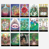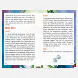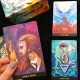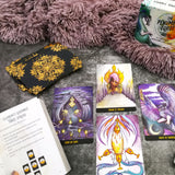 The 340 page guidebook includes an elemental Tarot deck blessing, Tarot activities, and four Tarot spreads. Each card has a traditional upright and reverse meaning written by Ethony, plus channelled meanings, artist notes, and a song provided by Eris Elizabeth.